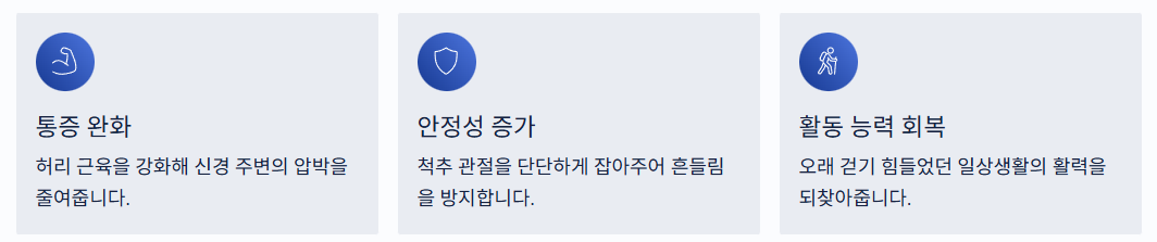 특히 요추 주변 근육이 약해지면 신경 통로가 더 좁아져 통증이 쉽게 재발합니다.