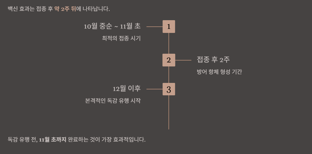 - 최적 시기 (10월 말 ~ 11월 초): 혼잡도가 완화되고, 독감 유행 전에 면역력을 완성할 수 있습니다.