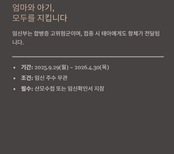 - 핵심: 임신부는 합병증 위험이 높고, 출산 후 신생아에게 항체를 물려줄 수 있습니다. 산모수첩이나 임신확인서 등 임신을 증명할 수 있는 서류를 반드시 지참해야 무료 접종 혜택을 받을 수 있습니다.
