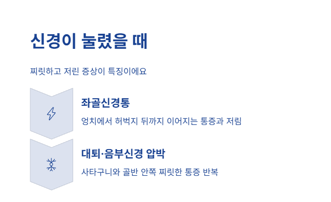 오래 앉는 습관, 좁은 의자, 장시간 운전 등으로 신경이 눌릴 때 생기는 통증입니다.