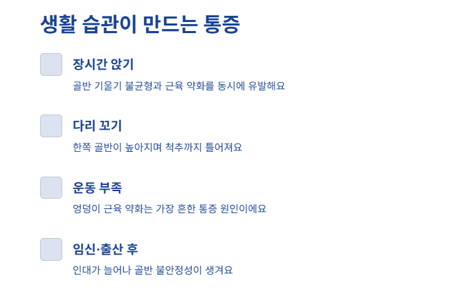 장시간 앉아 있으면 골반 기울기 불균형, 근육 약화, 신경 압박이 동시 발생합니다.