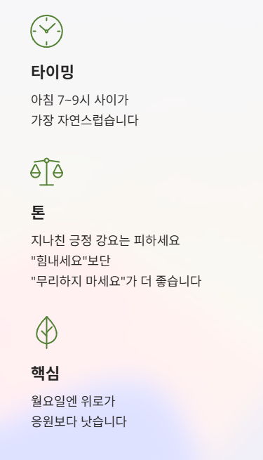 - “힘내세요”보단 “무리하지 마세요”가 더 반응 좋습니다