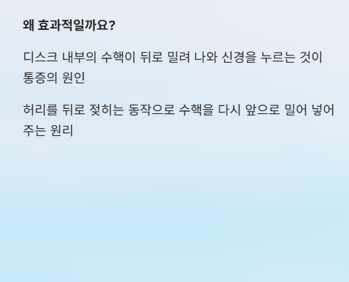 허리디스크 환자들에게 가장 기본이 되는 운동은 바로 맥켄지(McKenzie) 운동입니다. 디스크 내부의 수핵이 뒤로 밀려 나와 신경을 누르는 것이 통증의 원인인데, 허리를 뒤로 젖히는 동작을 통해 이 수핵을 다시 앞으로 밀어 넣어주는 원리입니다.