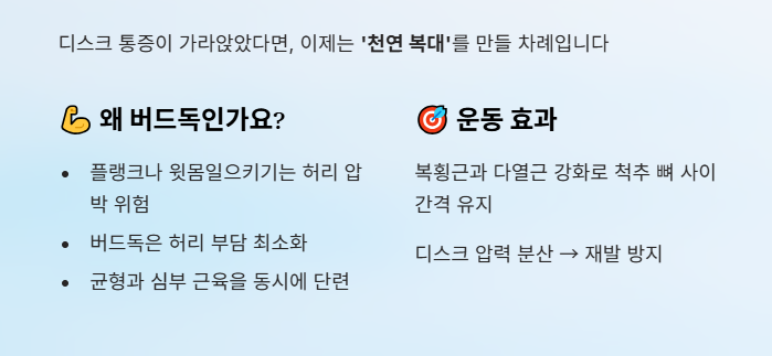 허리디스크 운동의 핵심은 "통증이 없는 범위 내에서, 척추의 자연스러운 곡선을 유지하며, 코어를 단단하게 만드는 것" 입니다.