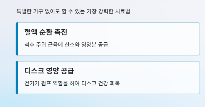 특별한 기구가 없어도 할 수 있는 가장 강력한 치료법은 '걷기'입니다. 걷기는 척추 주위 근육의 혈액 순환을 돕고 디스크에 영양분을 공급하는 펌프 역할을 합니다. 하지만 그냥 터덜터덜 걷는 것은 오히려 독이 됩니다.