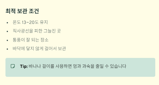 식탁 위에 그냥 두는 것보다 걸어서 보관하면 바닥에 닿는 면이 없어 멍과 과숙을 줄일 수 있습니다.