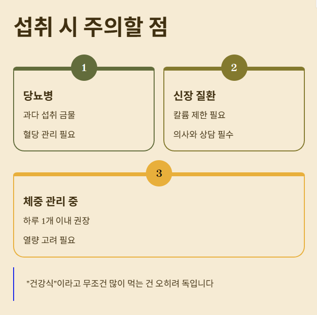 - 당뇨 → 과다 섭취 금물