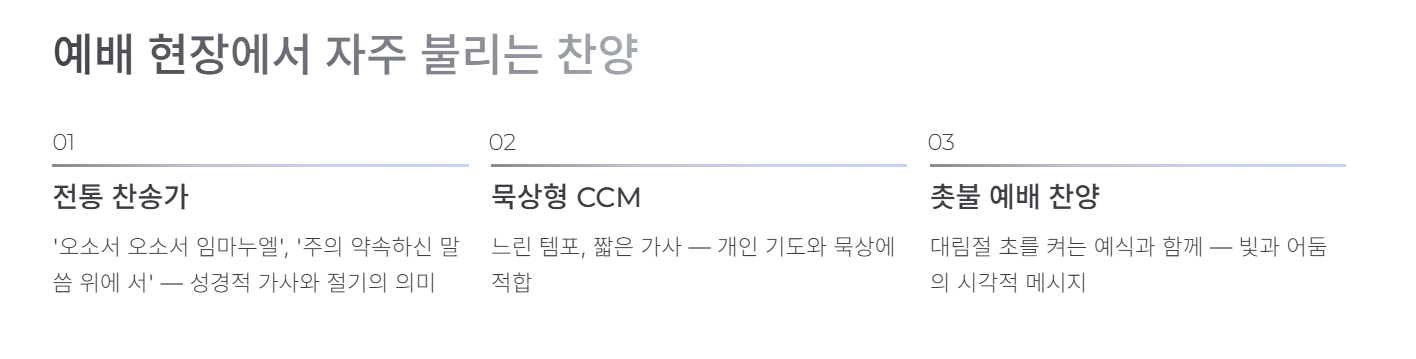 대림절 찬양은 특정 곡 몇 개로 정해져 있지는 않지만, 예배 현장에서 자주 사용되는 흐름은 분명합니다.