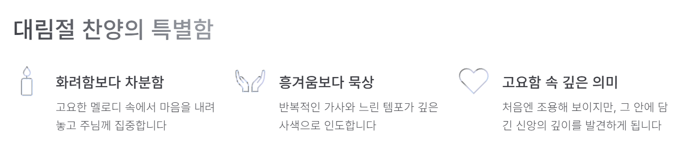 템포가 느리고 가사가 짧은 곡들이 많아 개인 기도나 묵상 시간에 자주 사용됩니다. 반복되는 가사 속에서 자연스럽게 마음이 가라앉고 집중하게 됩니다.
