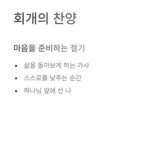 대림절은 마음을 준비하는 절기입니다. 그래서 자신의 삶을 돌아보게 하는 가사가 자주 등장합니다. 스스로를 낮추고 하나님 앞에 서게 만드는 힘이 있습니다.