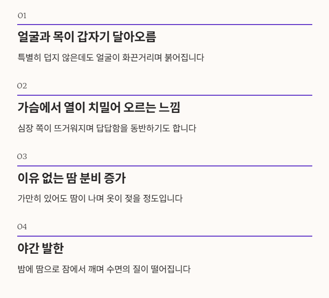 심장 쪽이 뜨거워지며 답답함을 동반하기도 합니다. - 이유 없는 땀 분비 증가