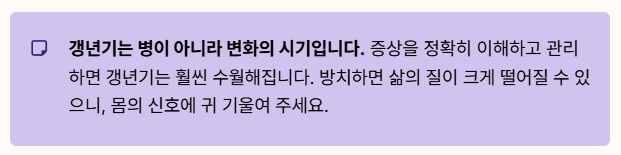 증상을 정확히 이해하고 관리하면 갱년기는 훨씬 수월해집니다.