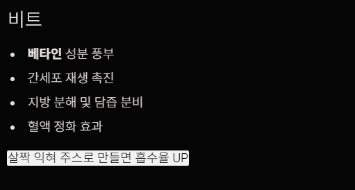 빨간색 비트에는 베타인 성분이 매우 풍부합니다. 베타인은 간세포의 재생을 돕고, 간에 쌓인 지방을 분해하며 담즙 분비를 촉진합니다. 혈액 정화 효과가 뛰어나 간의 해독 업무를 크게 덜어줍니다.