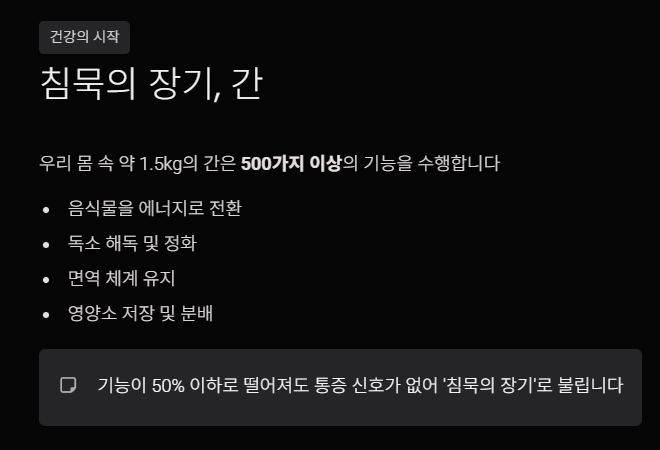 우리의 몸 안에서 약 1.5kg의 무게를 차지하는 '간'은 체내의 화학 공장이라 불립니다. 간은 우리가 섭취한 음식물을 에너지로 전환하고, 몸에 들어온 독소를 해독하며, 면역 체계를 유지하는 등 500가지가 넘는 복합적인 기능을 수행합니다. 하지만 간은 '침묵의 장기'라는 별명처럼 기능이 절반 이하로 떨어져도 특별한 통증 신호를 보내지 않습니다. 황달이나 심한 피로감이 나타났을 때는 이미 간 손상이 상당히 진행된 경우가 많습니다.