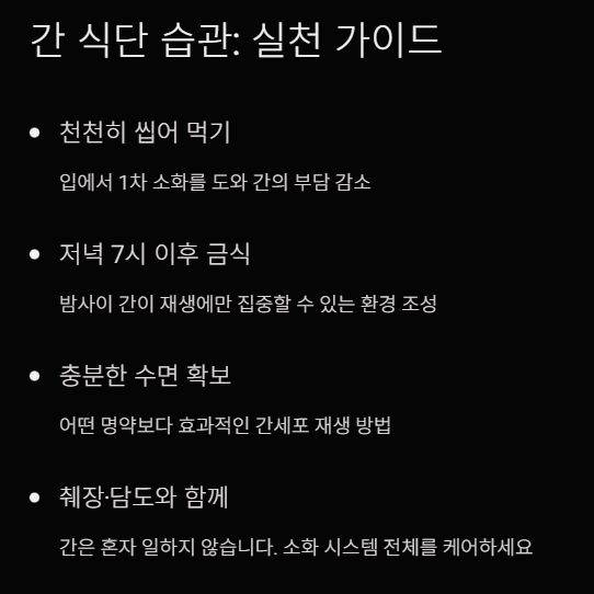 간은 혼자 일하지 않습니다. 췌장, 담도와 연결되어 소화 시스템을 구축합니다. 따라서 음식을 천천히 씹어 먹어 입에서 1차 소화를 돕고, 저녁 7시 이후에는 금식하여 간이 밤사이 재생에만 집중할 수 있는 환경을 만들어주어야 합니다. 특히 충분한 수면은 그 어떤 명약보다 간세포 재생에 효과적입니다.
