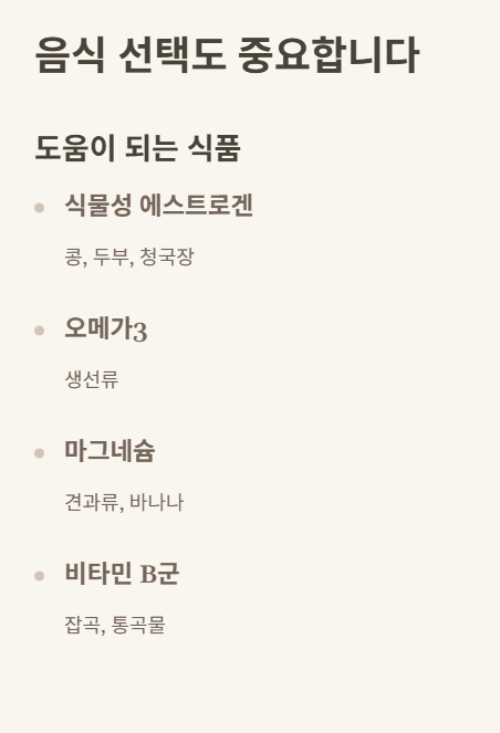 - 콩, 두부, 청국장 등 식물성 에스트로겐 식품