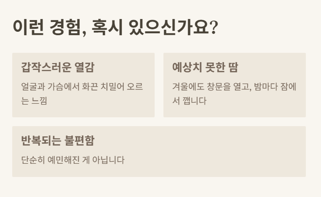 특히 야간 발한은 갱년기 열감의 대표 증상입니다.