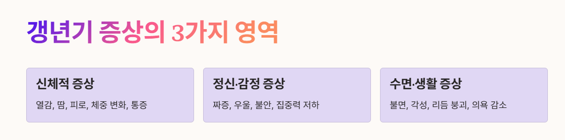 갱년기 증상은 신체·감정·생활 전반에서 다양하게 나타납니다.