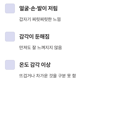 - 뜨겁거나 차가운 감각이 잘 느껴지지 않음