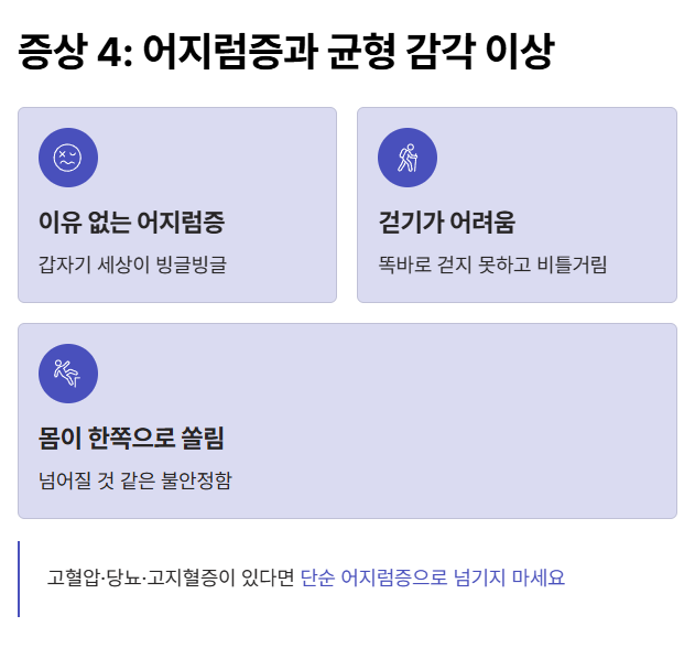 어지럼증, 말이 잠깐 꼬이는 느낌, 팔에 힘이 빠지는 느낌은 피로, 스트레스, 수면 부족으로 쉽게 오해됩니다.