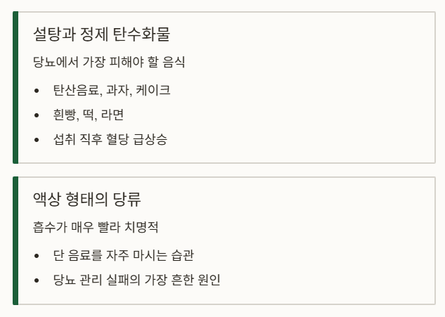 당뇨에서 가장 피해야 할 음식은 설탕과 정제 탄수화물입니다. 탄산음료, 과자, 케이크, 흰빵, 떡, 라면은 섭취 직후 혈당을 급격히 상승시킵니다.