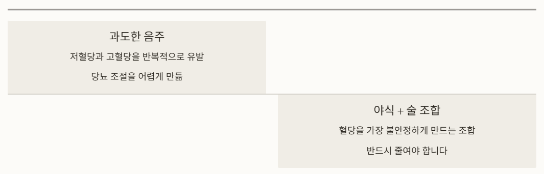 특히 야식과 술을 함께 먹는 습관은 혈당을 가장 불안정하게 만드는 조합이므로 반드시 줄이는 것이 좋습니다.