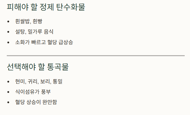 탄수화물은 당뇨에서 가장 민감한 영양소이지만, 완전히 끊을 필요는 없습니다. 문제는 정제된 탄수화물입니다. 흰쌀밥, 흰빵, 설탕, 밀가루 음식은 소화가 빠르고 혈당을 급격히 올립니다.