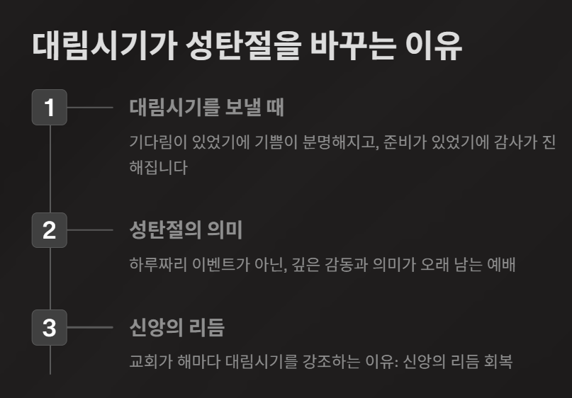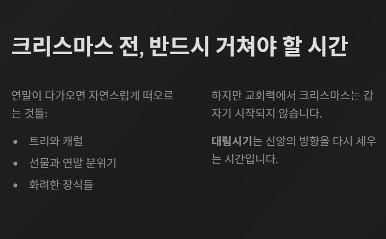 대림시기는 단순한 날짜 개념이 아니라, 신앙의 방향을 다시 세우는 시간입니다. 바쁘게 흘러가는 일상 속에서 멈춰 서서 “우리는 무엇을 기다리고 있는가”를 묻게 만드는 절기입니다.