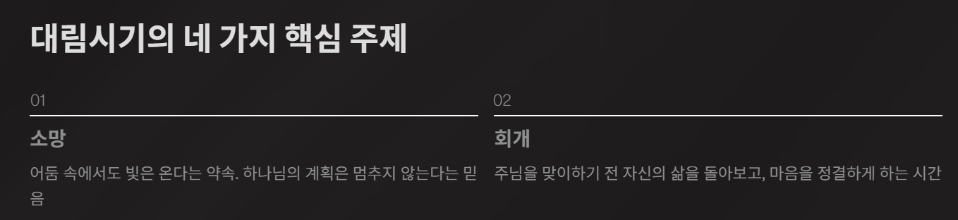 이 네 가지 주제는 대림시기를 단순한 기다림이 아닌, 점진적인 신앙 여정으로 만들어 줍니다.