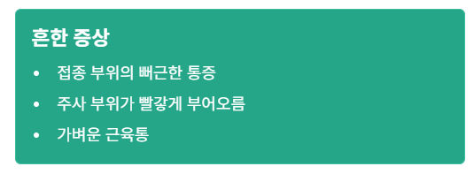 이런 증상은 몸이 면역반응을 보이는 과정이라 대부분 정상이며, 하루 이틀이면 가라앉습니다.