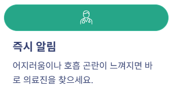- ✔ 어지러움, 호흡 불편감 느끼면 바로 의료진에게 알리기