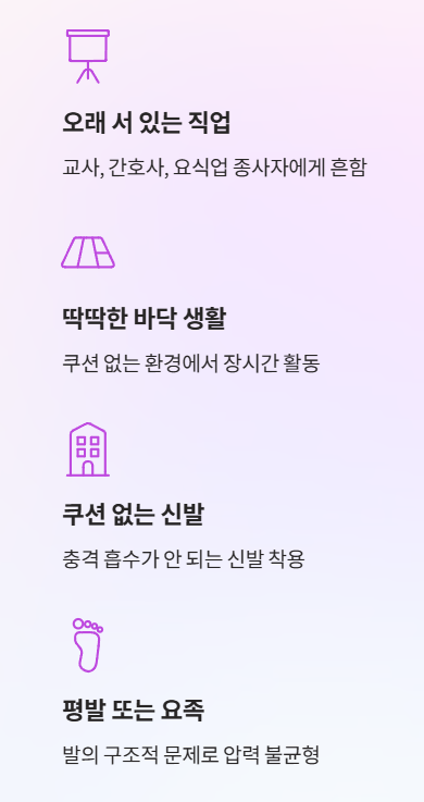 하루 종일 서 있거나 같은 자세로 오래 일하면 발뒤꿈치에 지속적인 압력이 가해집니다.