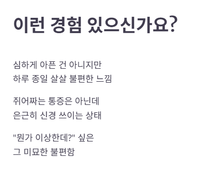통증의 위치와 패턴을 살펴보는 것이 가장 빠른 해결의 시작입니다.