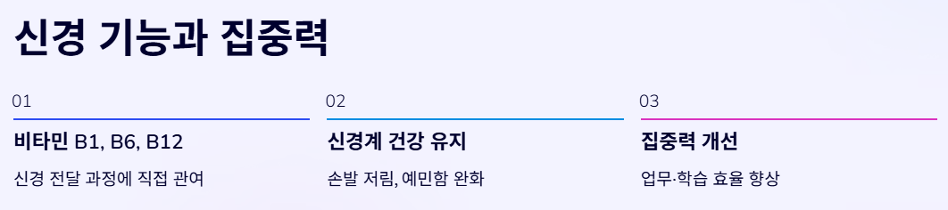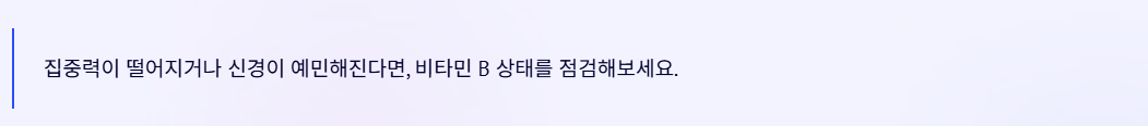비타민 B는 신경계 건강과도 밀접한 관련이 있습니다. 특히 B1, B6, B12는 신경 전달 과정에 관여해 손발 저림, 집중력 저하, 예민함 완화에 도움을 줍니다. 비타민 B가 부족한 상태가 지속되면 작은 자극에도 쉽게 피로해지고, 집중력이 떨어지거나 신경이 예민해지는 경우가 많아집니다. 업무나 학습 집중도가 떨어진다고 느껴질 때도 비타민 B 상태를 점검해볼 필요가 있습니다.