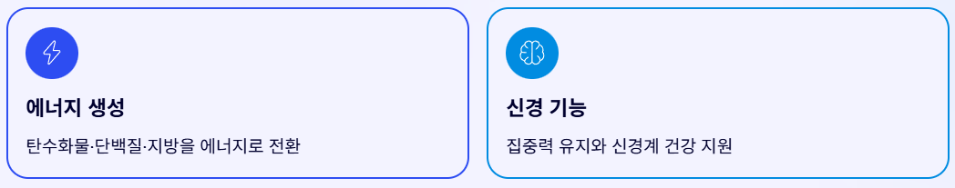 비타민 B군의 가장 중요한 기능은 에너지 생성입니다. 우리가 섭취한 탄수화물, 단백질, 지방이 에너지로 전환되는 과정에 비타민 B가 필수적으로 관여합니다. 비타민 B가 부족하면 충분히 먹어도 쉽게 피로해지고, 몸이 무겁게 느껴질 수 있습니다. 특히 활동량이 많거나 스트레스가 많은 사람일수록 비타민 B 소모량이 늘어나기 때문에, 체감 피로가 더 크게 나타날 수 있습니다.