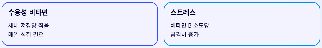비타민 B는 대부분 수용성 비타민으로 체내 저장량이 많지 않습니다. 그만큼 매일 꾸준히 섭취하지 않으면 부족해지기 쉽습니다.