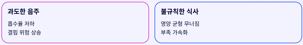 스트레스, 과도한 음주, 불규칙한 식사, 다이어트 등은 비타민 B 소모를 빠르게 만드는 대표적인 요인입니다. 현대인의 생활 패턴 자체가 비타민 B 결핍에 취약한 구조라고 볼 수 있습니다.
