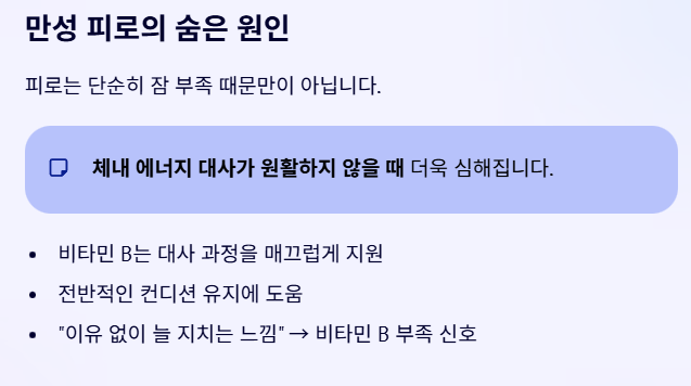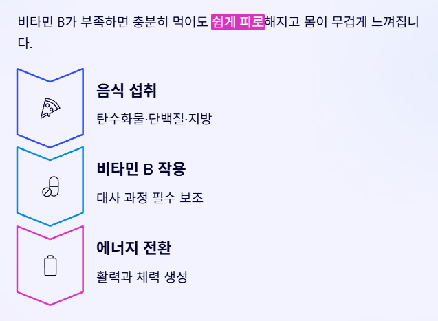 비타민 B군은 만성 피로 관리에 중요한 역할을 합니다. 피로는 단순히 잠을 못 자서 생기는 것이 아니라, 체내 에너지 대사가 원활하지 않을 때 더 심해집니다. 비타민 B는 이 대사 과정이 매끄럽게 돌아가도록 도와주기 때문에, 꾸준히 섭취하면 전반적인 컨디션 유지와 활력 개선에 도움이 됩니다. “아무 이유 없이 늘 지치는 느낌”이 든다면 비타민 B 부족을 의심해볼 수 있습니다.