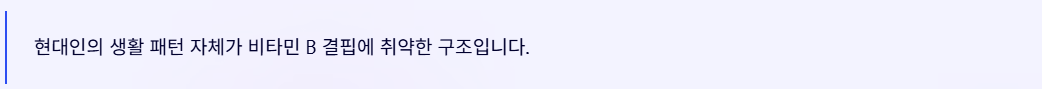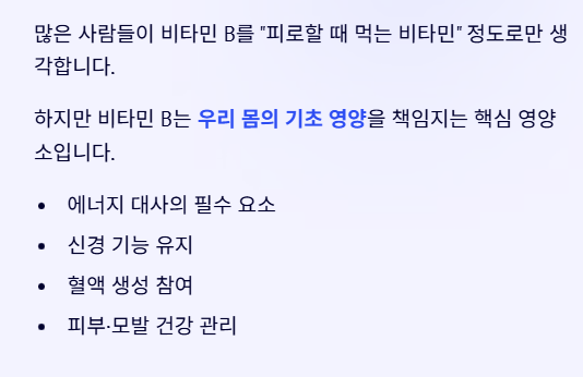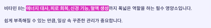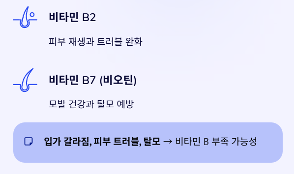 외적인 변화는 비교적 빨리 체감되는 편이기 때문에, 피부나 모발 컨디션이 눈에 띄게 나빠졌다면 비타민 B 섭취 상태를 점검해보는 것도 도움이 됩니다.