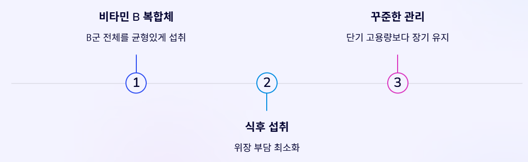 비타민 B는 한 가지보다는 비타민 B군 복합 형태로 섭취하는 것이 효율적입니다. 서로 보완적으로 작용하기 때문에 균형이 중요합니다. 또한 공복보다는 식후 섭취가 위장 부담을 줄이는 데 도움이 됩니다. 단기간 고용량보다는, 자신의 생활 패턴에 맞춰 꾸준히 섭취하는 것이 가장 현실적이고 안전한 방법입니다.