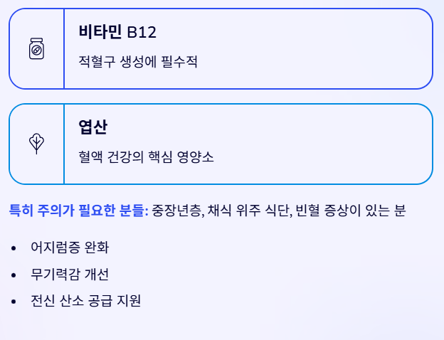 이들이 부족하면 빈혈, 어지럼증, 무기력감이 나타날 수 있으며, 특히 중장년층이나 채식 위주의 식단을 하는 사람에게서 결핍 위험이 높아질 수 있습니다. 비타민 B는 단순한 피로 회복을 넘어, 전신 순환과 산소 공급에도 중요한 역할을 합니다.