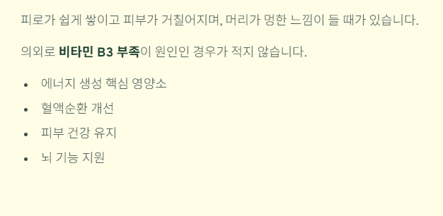 피로가 쉽게 쌓이고, 피부가 거칠어지며, 이유 없이 머리가 멍한 느낌이 들 때가 있습니다. 대부분 스트레스나 수면 부족을 떠올리지만, 의외로 비타민 B3(나이아신) 부족이 원인인 경우도 적지 않습니다.