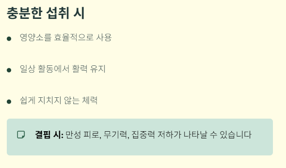 음식으로 섭취한 탄수화물, 단백질, 지방을 실제로 우리가 쓰는 에너지로 바꾸는 과정에 깊이 관여하기 때문에, 부족해지면 전반적인 컨디션 저하로 이어지기 쉽습니다.