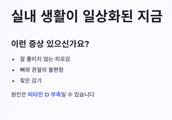 현대인의 소리 없는 경고, 비타민 D 부족증상을 놓치고 계신가요?혹시 요즘 들어 부쩍 몸이 무겁고, 충분히 잤는데도 피로가 가시지 않나요? 아니면 특별한 이유 없이 기분이 가라앉고 근육 여기