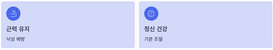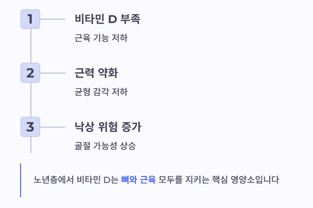비타민 D는 뼈뿐 아니라 근육 기능 유지에도 중요한 역할을 합니다. 근육의 수축과 균형 감각에 관여하기 때문에, 부족할 경우 근력이 약해지고 움직임이 둔해질 수 있습니다.