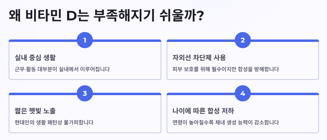 비타민 D는 햇빛을 통해 체내 합성이 가능하지만, 현대인의 생활 방식은 이를 충분히 충족시키기 어렵습니다. 실내 근무 중심의 생활, 자외선 차단제 사용 습관, 짧은 야외 활동 시간, 나이가 들수록 감소하는 합성 능력 등이 복합적으로 작용해 비타민 D 결핍을 쉽게 만듭니다. 이 때문에 햇빛 노출만으로 충분하다고 생각하기보다는 음식 섭취와 생활 습관, 필요 시 보충제를 함께 고려하는 접근이 현실적입니다.