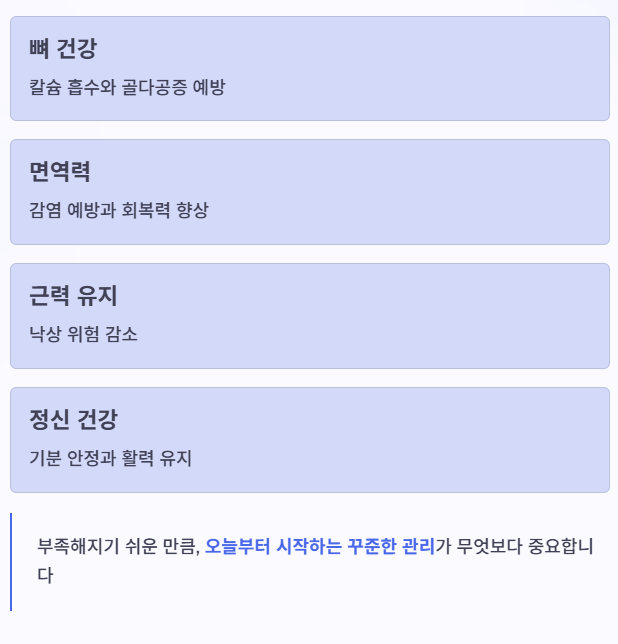 비타민 D는 뼈 건강과 면역력, 근력 유지, 정신 건강까지 폭넓게 관여하는 필수 영양소입니다. 부족해지기 쉬운 만큼, 생활 속에서 꾸준히 관리하는 것이 가장 중요합니다.