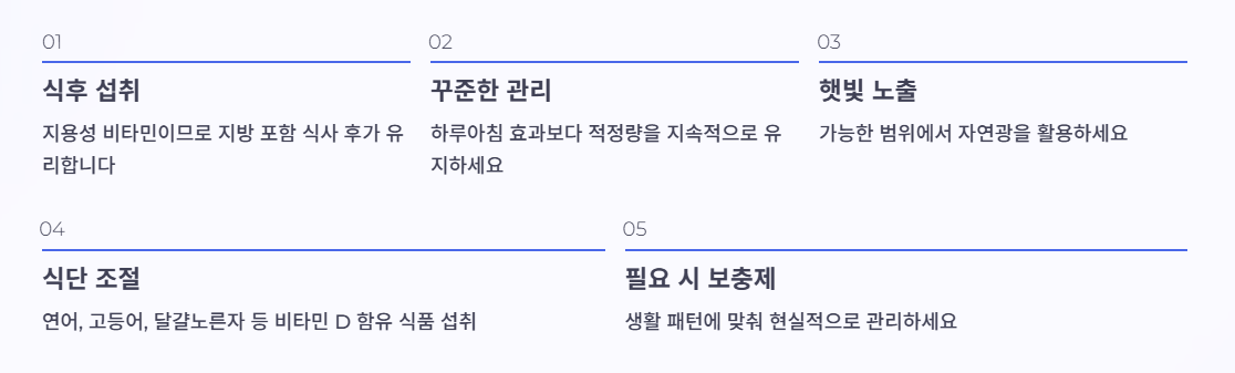 햇빛 노출, 식단 관리, 보충제 섭취를 자신의 생활 패턴에 맞게 조절하는 것이 가장 안전하고 효과적인 관리 방법입니다.