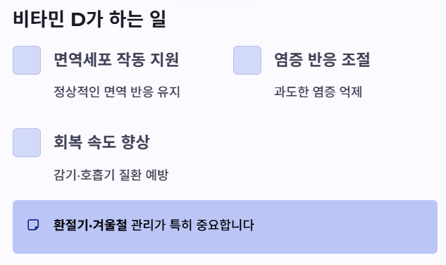 비타민 D 수치가 낮은 사람은 감기나 호흡기 질환에 자주 노출되는 경향이 있으며, 한 번 아프면 회복까지 시간이 더 걸리는 경우도 많습니다. 특히 햇빛 노출이 줄어드는 겨울철이나 환절기에 비타민 D 관리가 강조되는 이유가 여기에 있습니다.