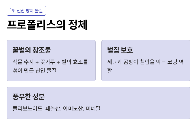 프로폴리스는 꿀벌이 식물의 수지와 꽃가루, 자신의 효소를 섞어 만든 천연 방어 물질입니다. 벌집 내부를 코팅해 세균과 곰팡이의 침입을 막는 역할을 합니다.